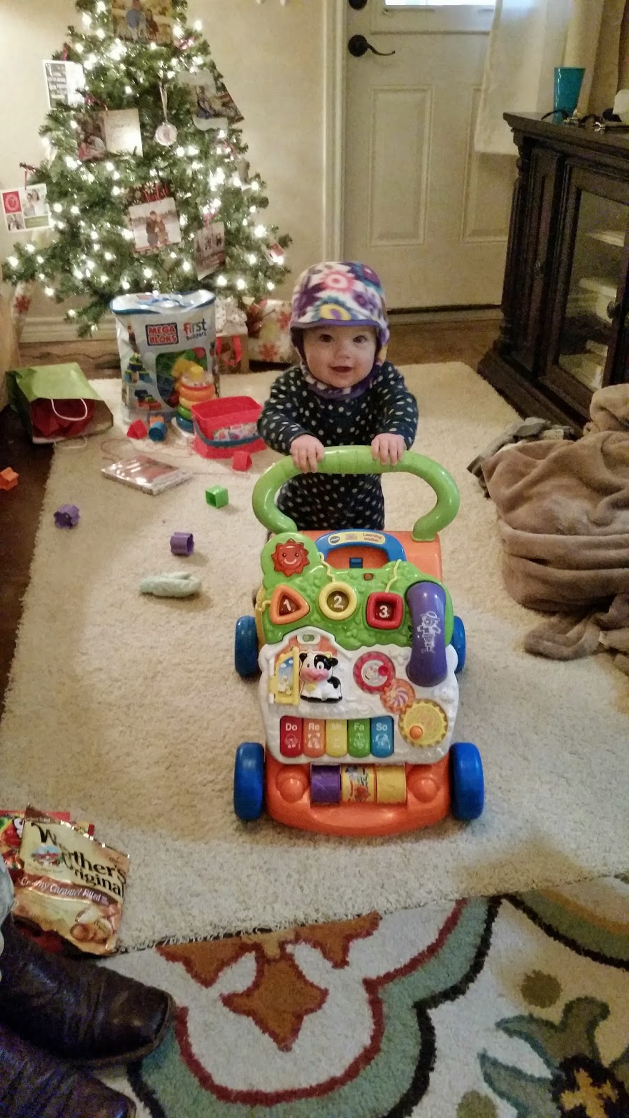 Tatum turned 9 months old on Christmas Eve. She still really enjoys her baby food but absolutely loves people food. Even though there isn't that much room in the barn we went ahead and moved her high chair in here so I could start feeding her more "people food" meals. She has started to stand on her own sometimes without realizing it and then quickly grabs on to something so she won't fall. It's just a matter of time before she is running around! She loves to get into the dog and cat food, chase Millie around, get into everything she shouldn't, fake cry, fake cough and is just the silliest girl around. Nine months is so much fun!